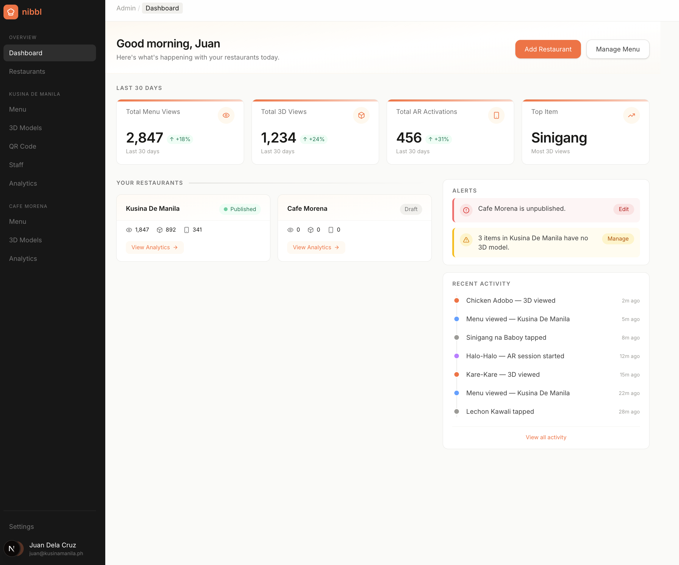 Manage everything from one dashboard — menu items, 3D models, QR codes, analytics, and branding.